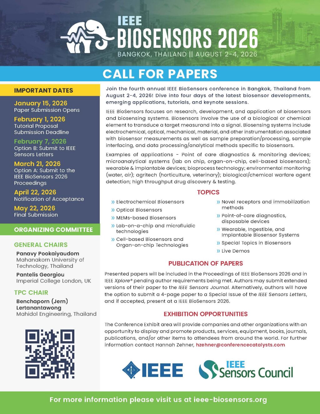 Full Length Conference Papers will be included in the Proceedings of IEEE BioSensors 2026 and in IEEE Xplore® pending author requirements being met. Authors may submit extended versions of their paper to the IEEE Sensors Journal. Alternatively, authors will have the option to submit a 4-page paper to a Special Issue of the IEEE Sensors Letters, and if accepted, present at a IEEE BioSensors 2026.